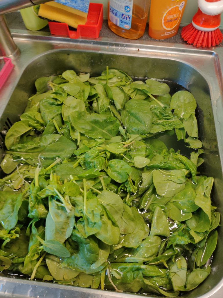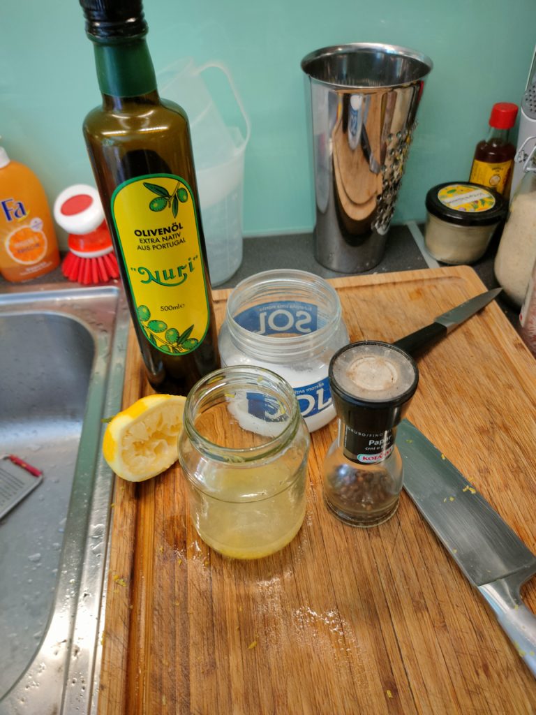 dann eine vinaigrette aus zitrone – mit zeste, salz, pfeffer, gutem olivenöl und ein bissi wasser machen